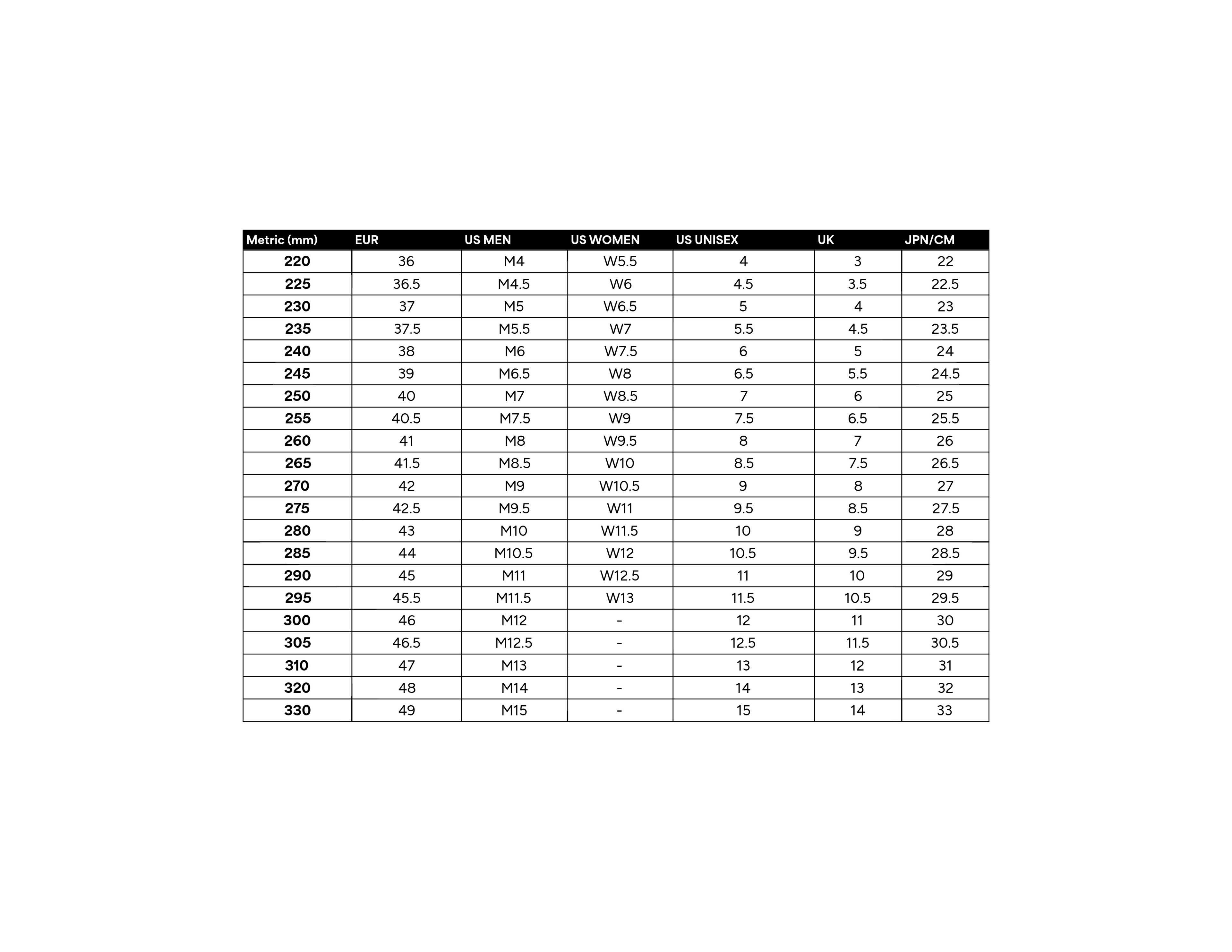 Wondering which size matches your foot length in millimeters? Used to a specific sizing system? Use the conversion table below to find your size or see how our sizes compare to international standards.